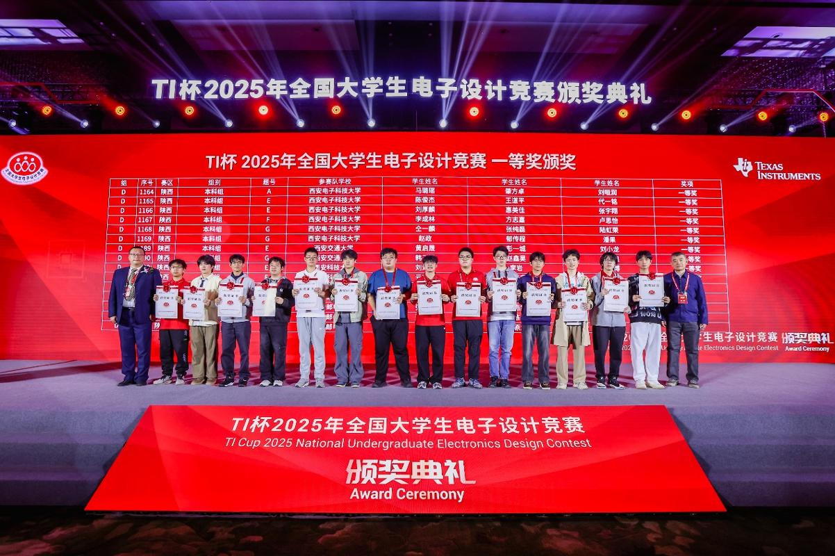 10月18日,2025年全国大学生电子设计竞赛(TI杯)颁奖典礼在北京举行,中国科学院院士、全国大学生电子竞赛组委会执行主任、西安交大电信学部主任管晓宏,西安交大党委副书记、纪委书记、国家监委驻西安交通大学监察专员马博虎,全国大学生电子设计竞赛组委会秘书长、西安交大电信学部罗新民教授,实践教学中心副主任陈立斌等出席大会并为获奖代表颁奖。德州仪器(TI)公司副总裁及中国区总裁姜寒,北京理工大学原副校长、全国大学生电子设计竞赛组委会副主任赵显利,电子科技大学党委常委、副校长孔令讲,全国大学生电子设计竞赛组委会委员、专家组常务副组长、同济大学岳继光,及竞赛组委会委员、专家组成员与获奖师生代表逾400人参加活动。西安交大学子斩获全国一等奖2项、二等奖8项,获奖师生代表受邀参会。