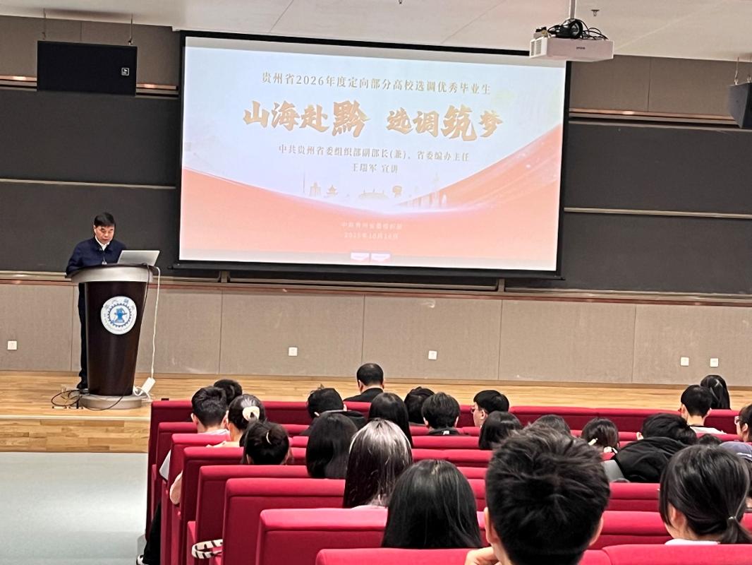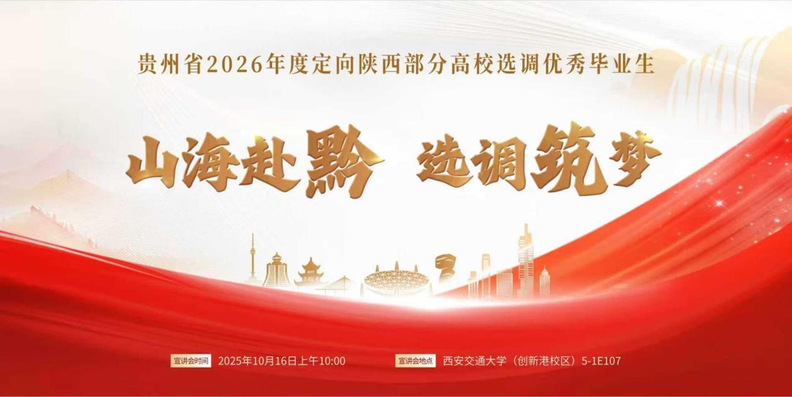 10月16日上午,贵州省2026年度定向选调宣讲会在西安交大创新港举办。本次宣讲会以“山海赴黔・选调筑梦”为主题,中共贵州省委组织部副部长(兼)、省委编办主任王瑞军同志作主旨宣讲。西安交大党委常委、组织部部长周远会见王瑞军,介绍了学校的历史沿革、人才培养情况,并就选调生的选拔推荐工作开展交流。
