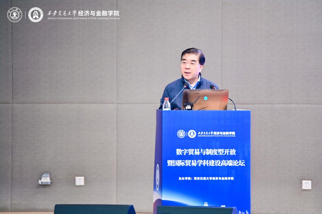 孙早在致辞中对与会专家学者的到来表示欢迎和感谢。他说,数字贸易与制度型开放是新时代国家对外开放战略的核心议题,国际贸易学科建设需主动对接国家需求、回应时代命题,并提出深化理论创新服务国家战略、加强高校学科协作共享资源、推动产教融合赋能产业三点倡议。他回顾了西安交大国际贸易学科30余年的发展积淀,表示学校将持续深化理论创新与产教融合,加强学科协同与资源共享,扎根西部,助力数字贸易发展。