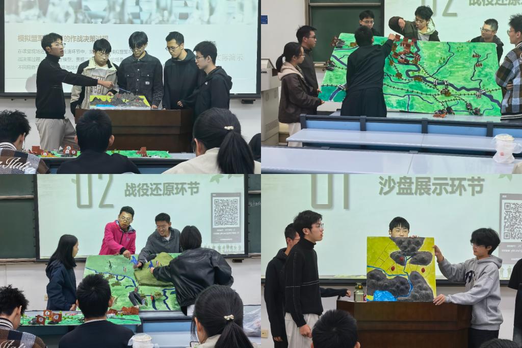 闫忠林教授与问鸿滨教授共同主持的通识核心课《战争与谋略:二战经典战役评析》则同时开展了沙盘推演与兵棋推演。在沙盘推演环节,四个小组的同学分别围绕“马斯河战役”“硫磺岛战役”“第三次哈尔科夫战役”和“罗马战役”进行展示,各小组的口号特色鲜明:“推演方寸间,决胜马斯河”“与其纸上谈兵,不如沙场点兵”“推演千遍,战则无险,预判万端,攻无不克”“挑战自我,突破极限”。值得一提的是,课程还专门设置了“莫斯科保卫战”兵棋推演环节,学生们在AI兵棋系统支持下,模拟苏德双方在1941年冬季的攻防对抗,体验战略决策的复杂性与历史转折点的重要性。