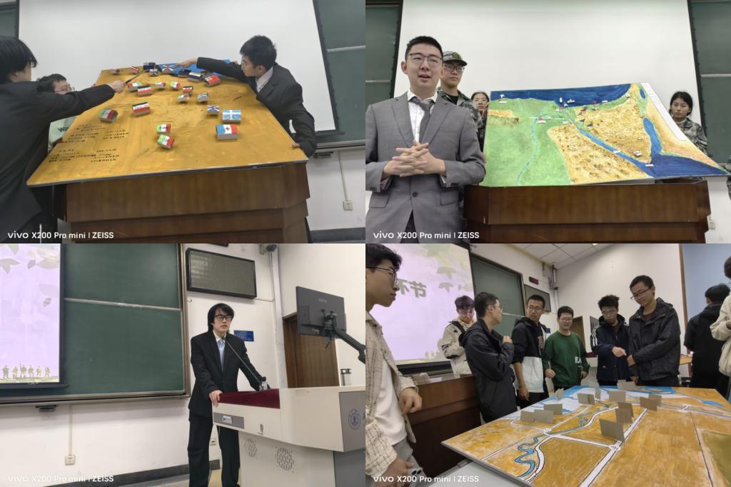 在闫忠林教授主持的选修课《中东问题与中东战争》的沙盘推演中,四个学生小组聚焦中东地区重要战役。第一组以“海湾战争”为主题,喊出“一个团队,一个目标,一个胜利”的响亮口号;第二组重现“两伊战争——霍拉姆沙赫尔战役”,彰显“生死相共,荣辱同担”的团队精神;第三组以“第二次阿拉曼战役”为背景,提出“沙盘之上谋战术,阿拉曼前鉴胜负”的推演理念;第四组则围绕“第二次中东战争”,用“胜者退场,输家为王,旧时代的黄昏,新秩序的黎明”深刻诠释战役的历史意义。