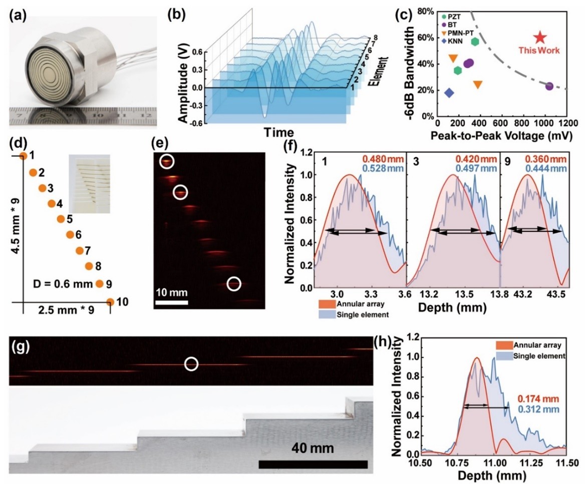 理论的突破最终要服务于实际应用。研究团队利用3D打印技术,成功制造出结构复杂的8阵元环形阵列超声换能器。性能测试表明,该换能器具有高达 60%的-6dB带宽(BW)和952 mV的脉冲回波峰峰值(Vp-p),综合性能优于其他3D打印换能器。在成像实验中,与单阵元换能器相比,该环阵换能器通过动态聚焦,将成像分辨率提升了10% ~ 55%,清晰地呈现了线靶和标准无损检测(NDT)试块的精细结构,充分证明了3D打印复杂结构压电阵元在提升器件性能方面的巨大潜力。