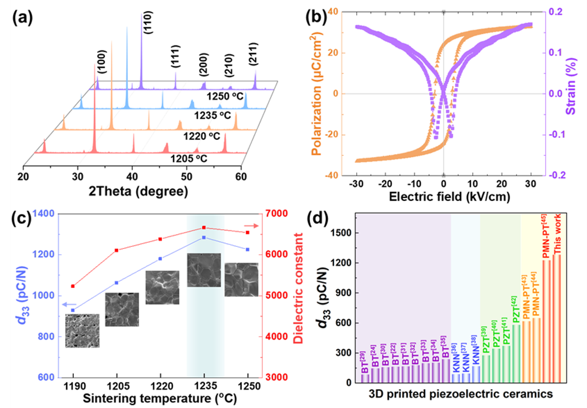在解决了打印成型的难题后,研究团队通过精细调控脱脂与烧结工艺,获得了致密度高达95%以上、无裂纹的压电陶瓷。随后,对粉体粒径和烧结工艺进行了系统优化,研究了3D打印压电陶瓷的微观结构和电学性能。采用平均粒径为1.0 μm的粉体,在1235 ℃下烧结制备的3D打印Sm-PMN-PT陶瓷展现出较高的压电性能,其压电系数d₃₃高达1285 pC/N。