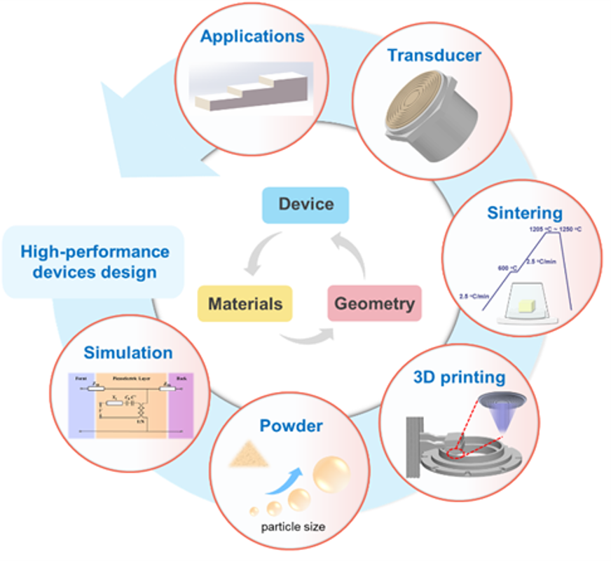 压电器件是现代医疗诊断、工业无损检测和智能传感系统的“心脏”,其中关键压电材料的高性能化与复杂结构成形能力对于实际应用都至关重要。与传统制备方法(如模具成型、机械加工)相比,3D打印技术在高精度阵列、曲面结构等复杂/异形结构压电陶瓷元件的制备方面已经逐渐展现出了成型速度快、设计灵活度高等突出优势。然而3D打印压电陶瓷致密化困难,电学性能与传统方法制备的陶瓷相比仍有差距,导致3D打印压电器件的性能受到限制,很难满足实际的工程应用需求。具体来讲,打通一条从“打印成型”、“烧结致密”到“器件集成”的完整技术链路,需要解决以下几个难题:首先将高折射率的压电陶瓷粉体(尤其是铅基粉体)引入光敏树脂中,会严重影响UV光的固化过程,极易导致固化性能差、分层开裂等问题,进而影响最终烧结陶瓷的性能;其次,生坯的后续烧结致密工艺的难点在于打印引入的微小缺陷可能导致烧结过程中的致密化不充分等问题,使陶瓷内部出现较多孔隙;最后,在器件应用环节,如何合理设计与材料匹配的器件结构,利用高性能和复杂/异形结构陶瓷制备出高性能的压电器件,并验证其在实际应用中的优势,也是一大难题。这些难题并非孤立存在,而是环环相扣。如何建立和实现从材料、打印到器件的一体化设计与制造,是当前3D打印压电陶瓷从实验室样品走向实际应用必须跨越的关键鸿沟。