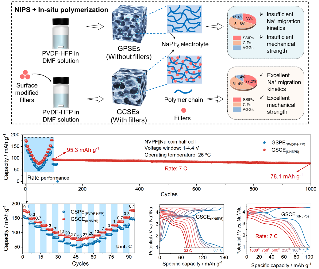 对此,西安交大徐友龙教授团队提出了一种分级“骨架优化-原位聚合”策略来构建高性能的GCSEs。该策略的核心是利用硅烷偶联剂KH550对NZSP填料进行表面功能化,改善填料在PVDF-HFP基体中的分散性。在此基础上,采用非溶剂诱导相分离(NIPS)技术制备了三维多孔骨架,实现了高达50 wt%的填料负载量,且不影响结构完整性和柔韧性。随后,该骨架和以ETPTA为交联单体,AIBN为引发剂的传统NaPF6电解液在加热条件下原位生成交联凝胶网络。该过程有效去除了残留溶剂,并减轻了钠金属界面处的副反应,同时保持了紧密的界面接触。所得GCSE实现了高达1.73 mS cm-1的离子电导率,对称Na||Na电池在0.1 mA cm-2的电流密度下稳定运行超过1500小时,以NVPF为正极的固态钠金属电池在33 C(6.40 A g-1)的高倍率下可提供接近100 mAh g-1的比容量,并在7 C倍率下循环1000次后容量保持率为82%,展现了优异的快充性能和循环稳定性。该设计不仅显著提升了固态钠金属电池的性能,而且展示了一种可扩展的设计框架,可用于构建稳定的、高导电性的电解质,并为固态金属电池的开发开辟了新的途径。