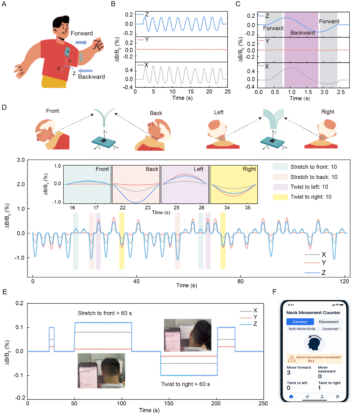 Figure 5. HPME的矢量运动监测。(A)在上臂放置两个HPME贴片以追踪前后摆臂的概念示意图。(B)连续摆臂过程中的实时三轴磁场。(C)单次摆臂的特征性三轴信号,突出方向相关特征。(D)四个方向的颈部运动监测(每个方向重复10次):上方示意图表示各运动对应的相对磁场方向;插图展示各单一方向的代表性信号。(E)日常伏案工作过程中记录到的实时颈部运动信号。(F)手机界面显示运动次数、长时间不对称姿势警报以及久坐预警。