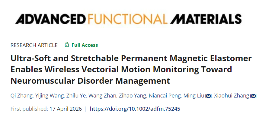 近日,该研究以《超柔可拉伸永磁弹性体实现无线矢量运动监测用于神经肌肉疾病管理》(Ultra-Soft and Stretchable Permanent Magnetic Elastomer Enables Wireless Vectorial Motion Monitoring Toward Neuromuscular Disorder Management)发表在《先进功能材料》(Advanced Functional Materials)上,西安交通大学生命科学与技术学院张晓慧教授、西安交通大学电子学院刘明教授为该论文通讯作者,生命科学与技术学院毕业博士研究生张淇为本文第一作者(现为甘肃中医药大学医学信息工程学院副教授)。本研究得到了国家自然科学基金、国家重点研发计划等项目的资助。