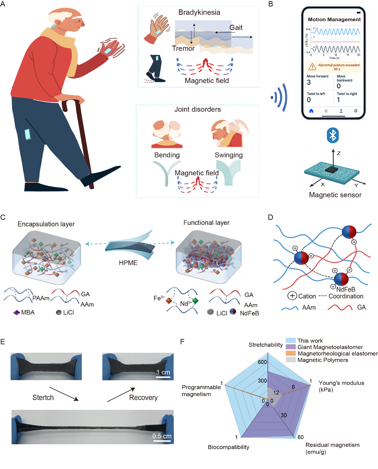 Figure 1. 基于HPME的人体运动传感器的设计与工作原理。(A)HPME用于无线、无源运动感知的工作原理示意图。(B)接收模块及运动监测软件用户界面示例。(C)HPME结构示意图,展示水凝胶内部的聚合物网络结构。(D)功能层中的分子交联示意图,突出双网络中的Nd³⁺/Fe³⁺配位作用。(E)拉伸性和弹性恢复性能展示。(F)不同柔性磁性材料在拉伸性、杨氏模量、剩余磁化强度、生物相容性和可编程磁性方面的性能比较。