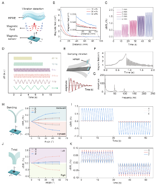 Figure 3. HPME作为振动传感器和应变传感器的性能。(A)HPME振动传感器示意图。(B)不同NdFeB负载量HPME中心面外磁场的衰减。(C,D)对受控振动幅值(C)和频率(D)的响应。(E)粘附HPME传感器的钢悬臂梁阻尼振动示意图。(F)对阻尼振动的实时磁场响应。(G)传感器信号的快速傅里叶变换(FFT),显示主导振动频率。(H)弯曲应变感知示意图(相对于霍尔传感器的z轴)及其模拟磁场分布。(I)弯曲应变下测得的磁场。(J)扭转应变感知示意图(绕y轴)及其模拟磁场分布。(K)扭转应变下测得的磁场。