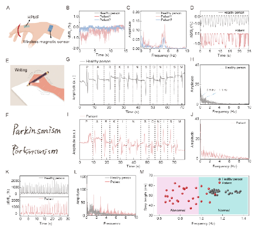 Figure 4. 利用HPME监测早期帕金森样症状。(A)采用HPME贴片进行手部震颤监测的示意图。(B)模拟重度/轻度帕金森样震颤与健康对照的实时磁信号。(C)突出显示主导震颤频率的频谱图。(D)模拟帕金森病与健康对照前臂运动的实时监测。(E)书写过程中震颤监测示意图。(F)代表性书写样本:正常与模拟震颤。(G,H)健康个体书写诱导的实时磁场(G)及对应的FFT分析(H)。(I,J)模拟帕金森样震颤个体书写诱导的磁场(I)及FFT分析(J)。(K)模拟帕金森病与健康对照的实时步态监测。(L)步态信号的FFT分析。(M)模拟患者与健康对照步态监测中的步频和步幅。