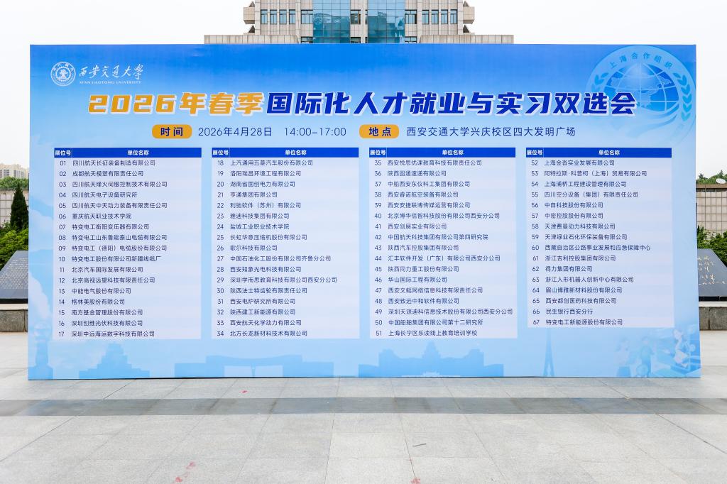 为深度服务国家“一带一路”倡议与上海合作组织发展,精准对接企业全球化布局与国际化人才需求,4月28日,西安交通大学牵头,联合西北农林科技大学、西安电子科技大学、西北大学、长安大学、陕西师范大学、西安外国语大学、西北政法大学等高校共同举办的2026年春季国际化人才就业与实习双选会在西安交大举行。本次双选会面向有意赴境外工作的中国学生与在华外籍留学生,以高效对接助力国际化人才实现高质量就业。