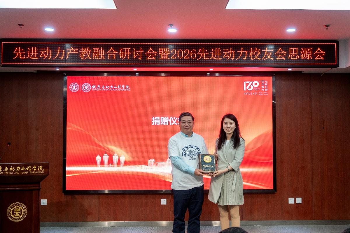学校教育基金会秘书长助理毛珊向先进动力校友会会长白洪法颁发捐赠纪念铭牌。