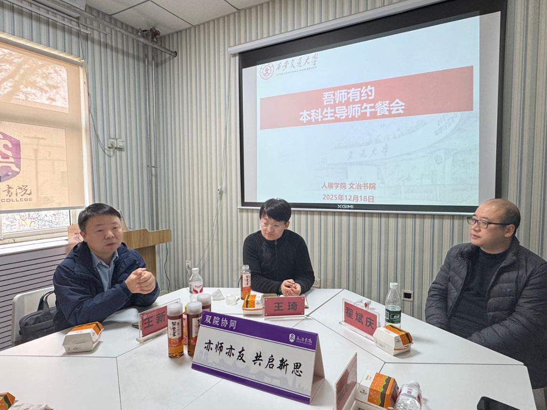 着力提升育人实效,创新师生对话载体,12月18日中午,西安交大文治书院联合人居学院举办“吾师有约”本科生导师午餐会。活动邀请人居环境与建筑工程学院党委副书记王新轲、教学副院长翟斌庆、建筑学系大数据方向教学副主任崔鑫、土木工程系土木方向教学副主任张敬华、土木工程系建环方向教学副主任蔡皖龙、地环方向本科生导师陈美娟、人居新生班主任代表徐芙清、教学秘书张峰瑞参加,文治书院院务主任王琦、学业专项负责人叶倩参与。