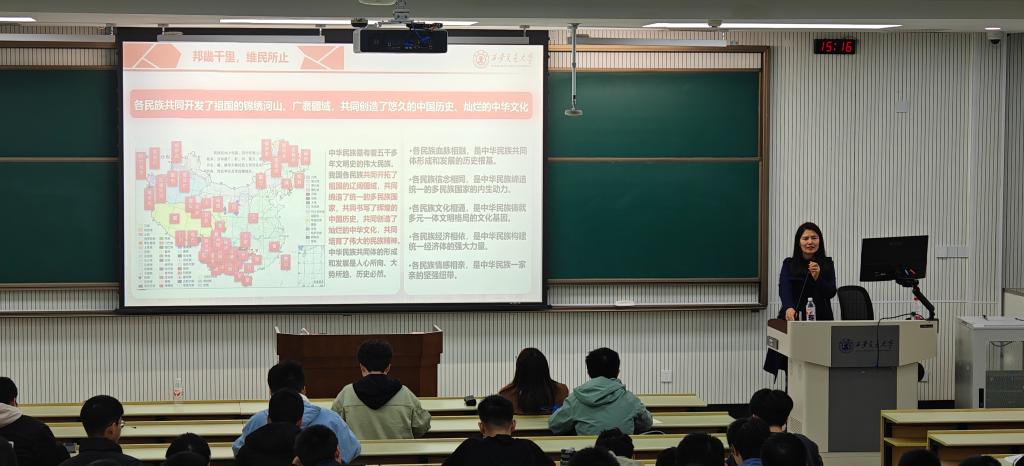 马克思主义学院助理教授武星星以“理解中华民族文化主体性,增强做中国人的志气、骨气、底气”为主题,以历史为引阐释文化主体性内涵,讲解增强文化主体性的六大途径,鼓励同学们通过研习中华文化史、讲好中国故事等方式,在新时代积极传承与发扬中华优秀传统文化,在文化自信中担当时代责任。