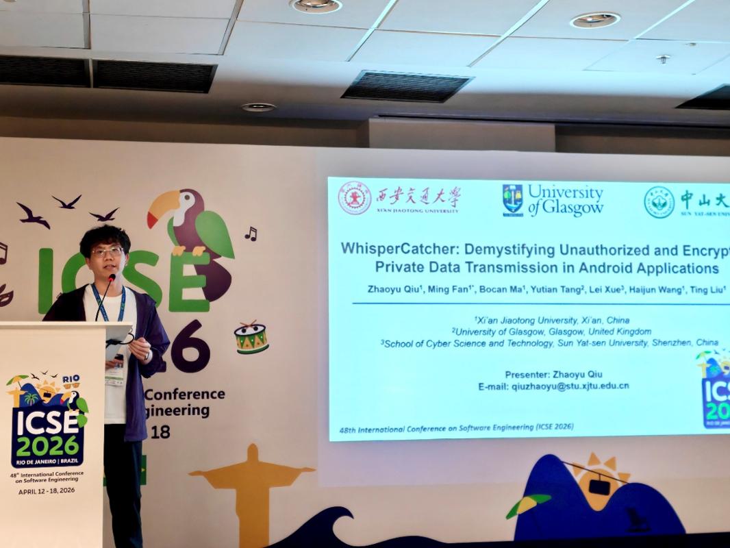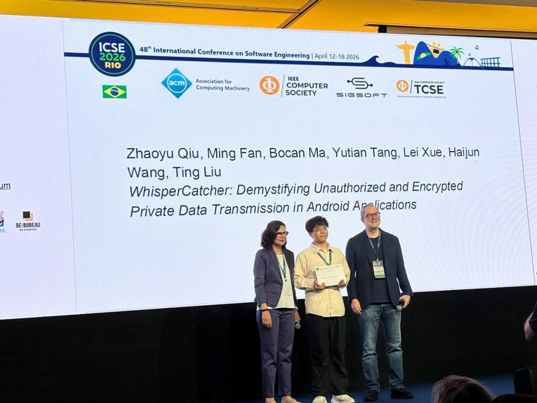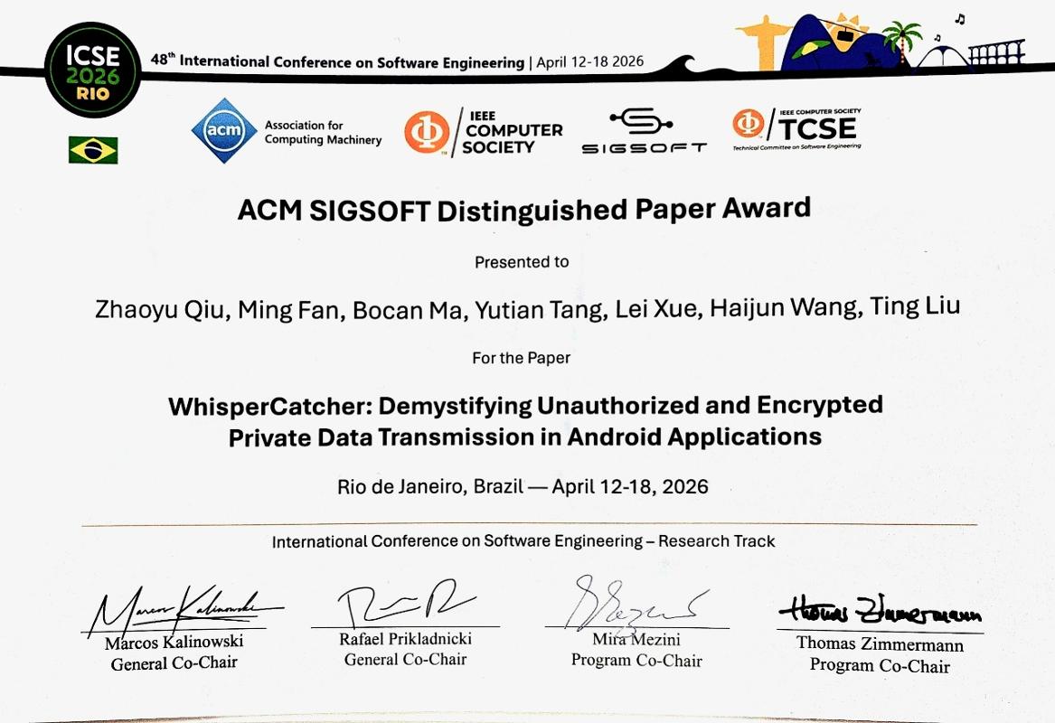 近日,第48届国际软件工程大会(ICSE 2026)在巴西里约热内卢召开。西安交通大学电信学部网络空间安全学院硕士研究生仇召昱、马博灿的论文“WhisperCatcher: Demystifying Unauthorized and Encrypted Private Data Transmission in Android Applications”荣获ACM SIGSOFT 杰出论文奖(Distinguished Paper Award)。该文章由西安交通大学刘烃、范铭教授团队与英国格拉斯哥大学唐宇田助理教授、中山大学薛磊教授合作完成。