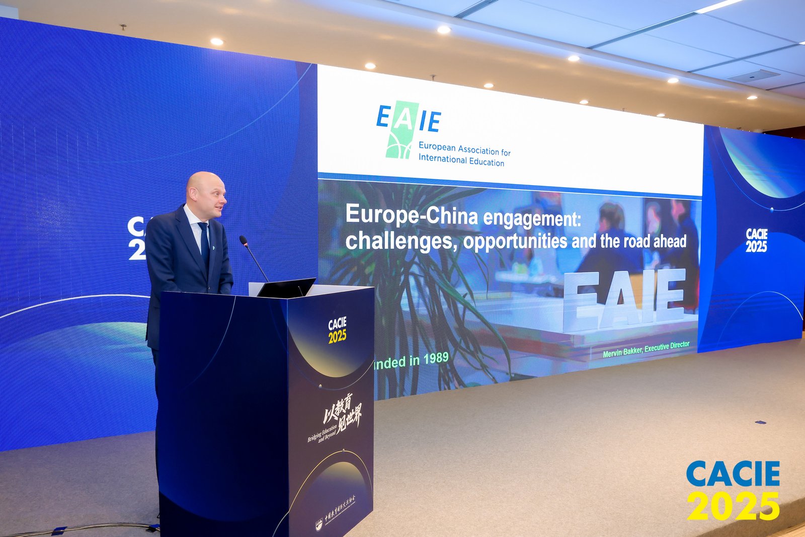 梅尔文·贝克围绕“数字化与智能化赋能的未来高等教育合作新范式”分享了欧洲国际教育协会(EAIE)在国际交流方面的作用,表示协会持续探索中欧学生流动与科研交流的新领域、新路径。