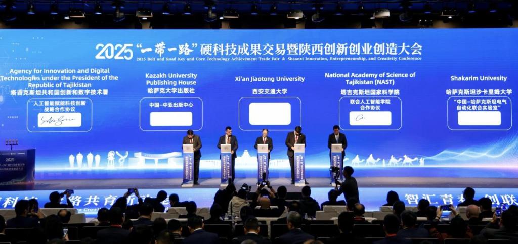 西安交通大学分别与阿里·法拉比哈萨克国立大学、塔吉克斯坦国家科学院、塔吉克斯坦共和国创新和数字技术署、哈萨克斯坦沙卡里姆大学签署合作协议。柴渭、哈萨克大学出版社社长阿比尔·卡里姆哈诺夫、塔吉克斯坦国家科学院副院长科迪尔佐达·法尔霍德·安瓦尔、塔吉克斯坦共和国创新和数字技术署电子商务监管部门负责人索利耶夫·法鲁赫·尤努索维奇、哈萨克斯坦沙卡里姆校长杜曼・奥林别科夫共同签约。
