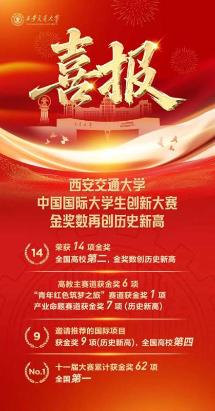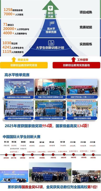 学校尤为注重通过组织学生参与中国国际大学生创新大赛等高水平赛事,引导学生将学习研究与科技前沿、产业关键领域的实际问题紧密结合,有力推动产学研深度融合与协同发展。2025年,西安交大在各类高水平榜单竞赛中荣获国家级奖项554项,其中国家级最高奖项134项。特别是在中国国际大学生创新大赛全国总决赛中斩获金奖14项,位居全国高校第二;在已举办的十一届赛事中,学校累计获得金奖62项,金奖总数位列全国高校之首。