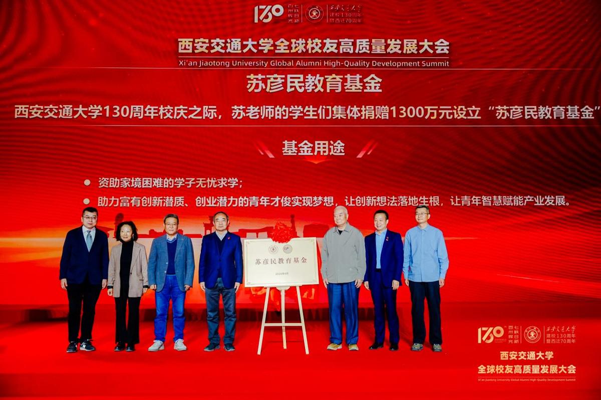 西安交大党委常委、宣传部部长、统战部部长成进,电气学院党委书记梁得亮,电气学院教授苏彦民,学子代表白小青、韩晓梅、卢家林、孟永庆为“苏彦民教育基金”揭牌。