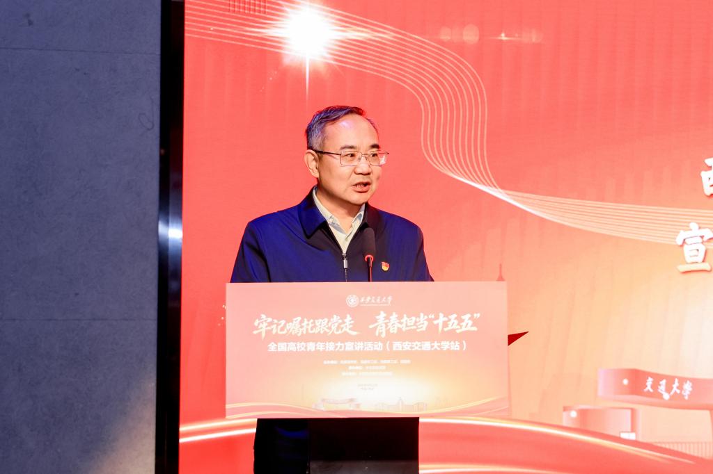 西安交通大学党委常委、宣传部部长、统战部部长成进致欢迎辞。他向所有支持学校宣讲工作发展的兄弟院校表示衷心感谢,并介绍了西安交通大学“六类宣讲体系”和学生微宣讲团的建设发展情况。他指出,近日,习近平总书记给四所交通大学全体师生回信强调,要传承弘扬西迁精神聚焦国家重大战略需求,为建设教育强国、科技强国、人才强国作出新贡献。此次接力宣讲活动聚焦学习习近平总书记重要回信精神,畅谈“十五五”时期青年担当,希望各高校青年宣讲骨干深学细悟、互学互鉴、勇担使命,携手编织“立足陕西、辐射西部、联动全国”的青春宣讲网络。希望各高校以此为纽带凝聚宣讲合力,共担强国使命,让信仰在接力中传承、让奋斗在征程中回响。
