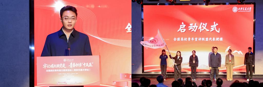 清华大学博士生讲师团团长郭耀普代表全国高校青年宣讲联盟发言,并宣读《“接力宣讲”倡议书》,号召各高校青年宣讲组织联学联讲、携手同行。在启动仪式环节,联盟执委会成员单位代表依次上台,郭耀普为西安交通大学学生微宣讲团代表刘婉洁授旗,宣告本学期全国高校青年接力宣讲活动正式启动。