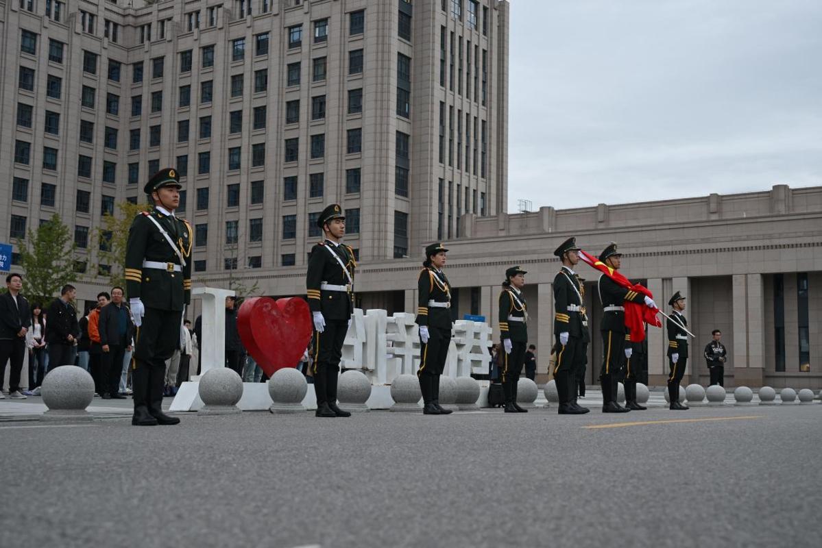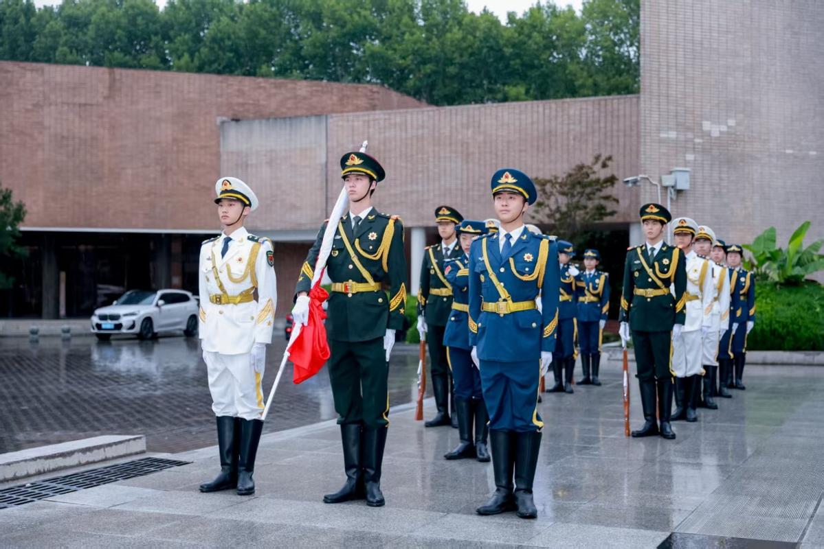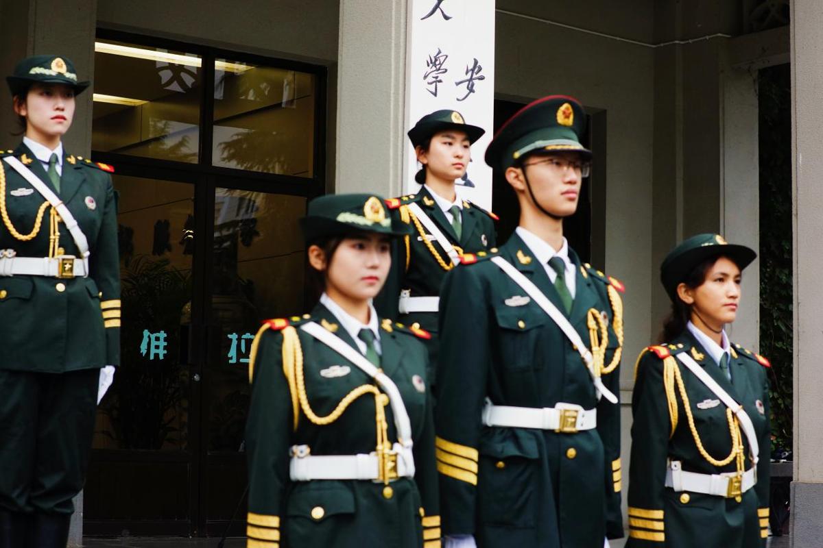 七时整,升旗仪式正式开始。西安交通大学国旗护卫队队员们步伐坚定、气势如虹,以整齐划一的队列护卫着五星红旗迈向升旗台。