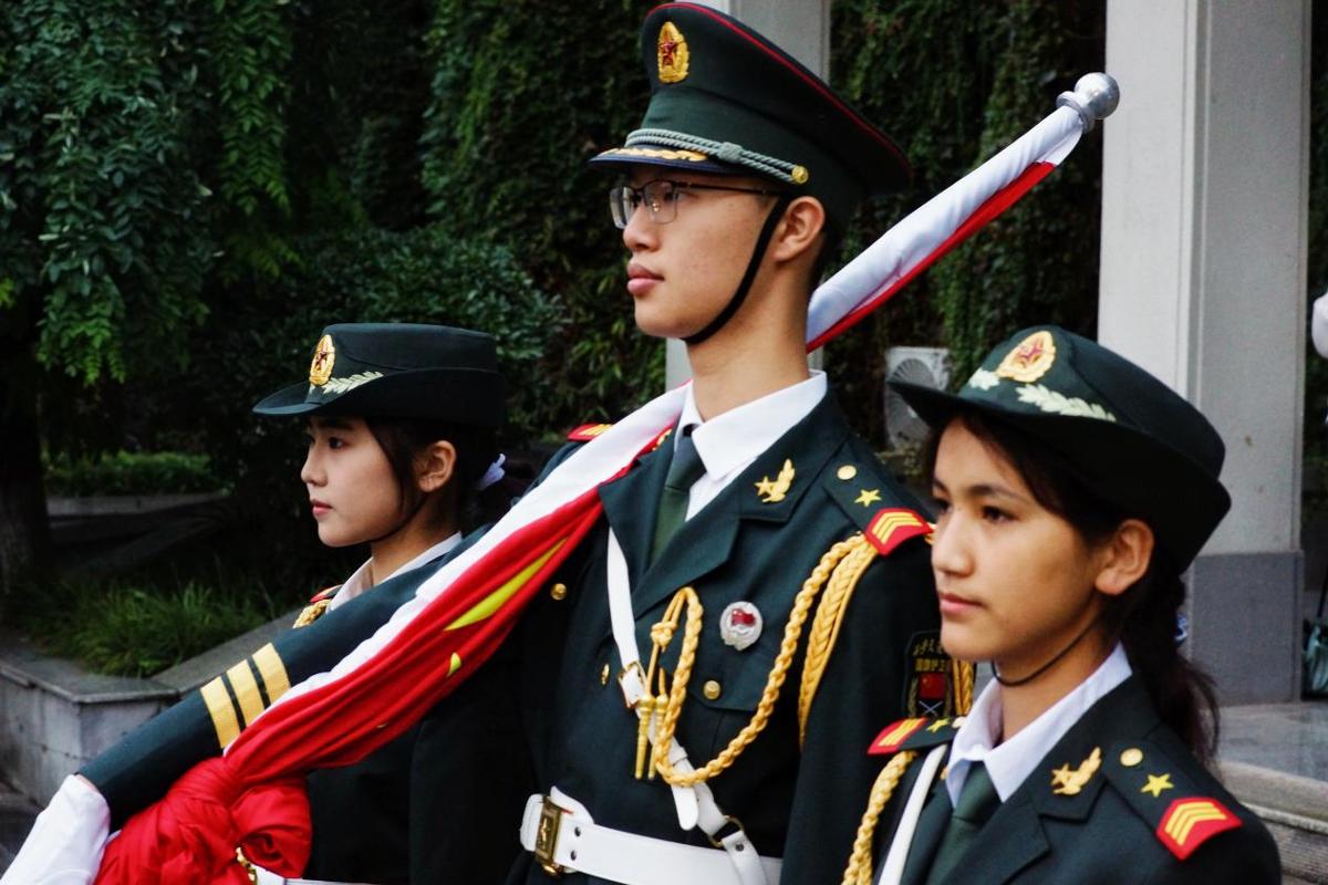 国旗护卫队队员卞禹琪紧握钢枪,身姿挺拔。她说:“一代人有一代人的长征路,我们青年一代定要不畏艰险,踔厉奋发,为中华民族伟大复兴贡献青春力量。”