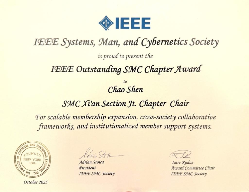 10月7日,IEEE系统、人、控制论学会(IEEE Systems, Man, and Cybernetics Society, IEEE SMCS)举行2025年度特别活动及颁奖仪式。由西安交通大学电子与信息学部沈超教授担任主席的IEEE系统、人、控制论联合学会西安分会(Xi'an Section Joint Chapter[IEEE SMCS & IEEE CSS])荣获2025年度IEEE系统、人、控制论学会杰出分会奖(IEEE Outstanding SMC Chapter Award)。该奖项在全球范围内遴选,经学会提名委员会推荐及评奖委员会评审,最终IEEE SMC Xi'an Section Joint Chapter成为本年度唯一获奖分会。