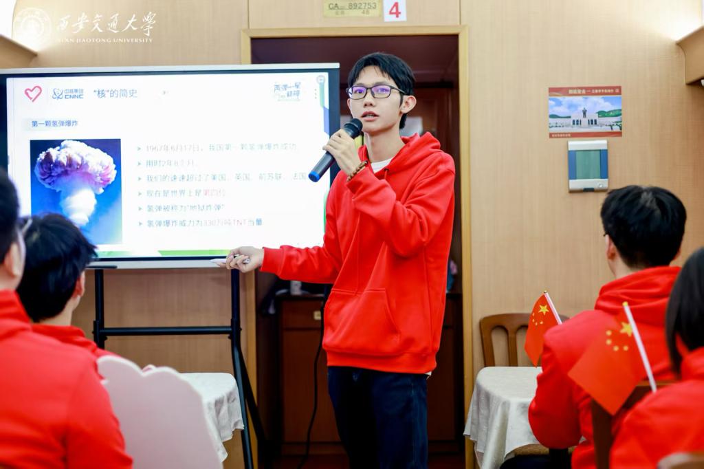 9月27日上午,在“三秦学子圣地行”活动列车上,宣讲人赵依哲以“铀的三生三世”为题,生动讲述铀元素的开采与利用,将复杂的核能知识转化为通俗易懂的语言,鼓励青年将科技报国与精神铸魂相结合,不负青春韶华。同日,学生微宣讲团成员党嘉琦走进西安交通大学核能俱乐部,以王淦昌等“两弹一星”元勋的故事为引,阐释“热爱祖国、无私奉献、自力更生、艰苦奋斗、大力协同、勇于登攀”的“两弹一星”精神内涵。宣讲后,同学们围绕核能发展趋势、安全利用等议题展开热烈讨论,进一步激发了以科学报效祖国的热情与担当。