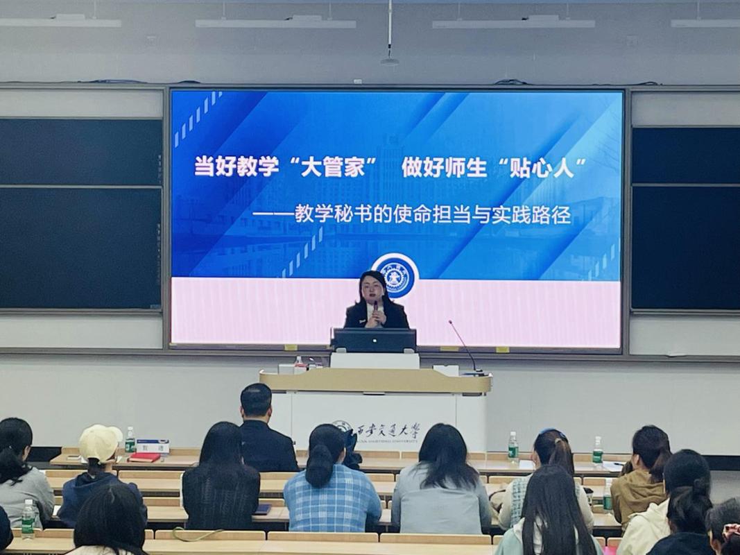 教务处副处长贺进作题为《当好教学“大管家”做好师生“贴心人”——教学秘书的使命担当与实践路径》的专题报告。报告深入剖析了新时代背景下教学秘书的角色定位、核心能力及如何履行好双重角色的实践路径。她结合生动教学案例,通过标准化筑基、信息化赋能、服务化提质、协同化增效四个层次,为教学秘书做好教学运行、质量保障和师生服务提供工作指引。她鼓励教学秘书在工作实践中不断强化责任心、细致心和服务心,提高规范意识和创新意识,提升信息化应用能力、政策解读能力、沟通协调能力和应急处理能力,努力成为业务精湛、师生信赖、管理高效的教学管理骨干。
