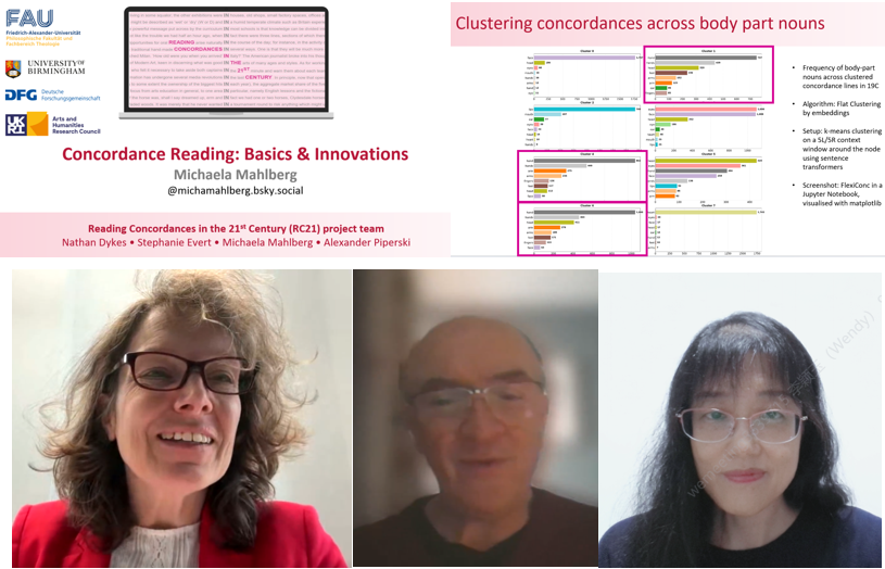 论坛遵循系列活动高端访谈、专题讲座和问答互动的特色模式,围绕检索行分析与数字人文研究展开。访谈环节,Mahlberg教授和McEnery教授围绕研究问题与研究方法的关系、语料库方法面对的批评以及检索行跨学科应用等问题展开对话。讲座环节,Mahlberg教授分析了检索行发展史,分享了RC21项目中引入分类方法的实践经验,展示了新开发的FlexiConc工具在CLiC语料库中的应用。McEnery教授结合讲座内容为参会者提供了丰富的相关信息和文献资源。问答环节,两位专家对人工智能辅助分析、检索行在跨学科应用中需要注意的问题等进行了耐心细致的解答。
