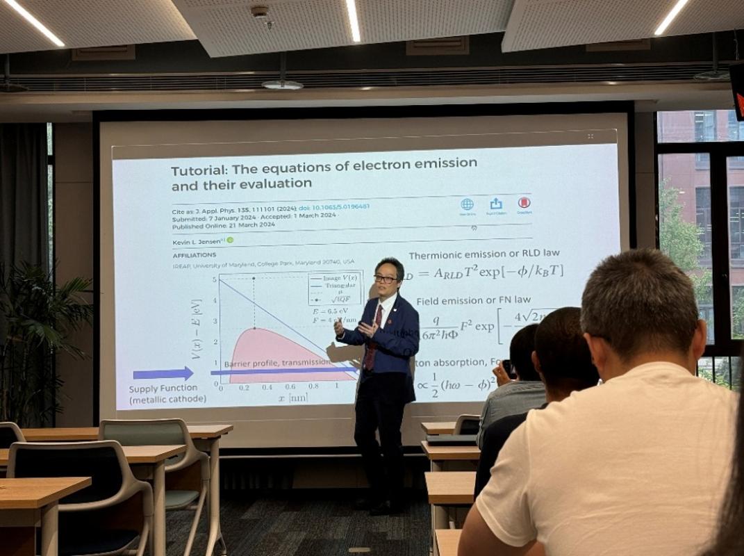 聘任仪式结束后,Lay Kee Ang作了题为《二维材料电子发射模型及应用》(“Modern models of electron emission for 2D materials and its applications”)的学术报告,回顾了场致电子发射的经典理论模型,详细介绍了团队在二维材料场发射理论方面的最新进展,并创新性提出了基于分数维度的场发射模型,可以很好解释纳米尺度的场发射行为。研讨环节,与会师生就二维材料场发射、热电子发射和光电发射等问题与Lay Kee Ang开展了深入的交流和讨论。