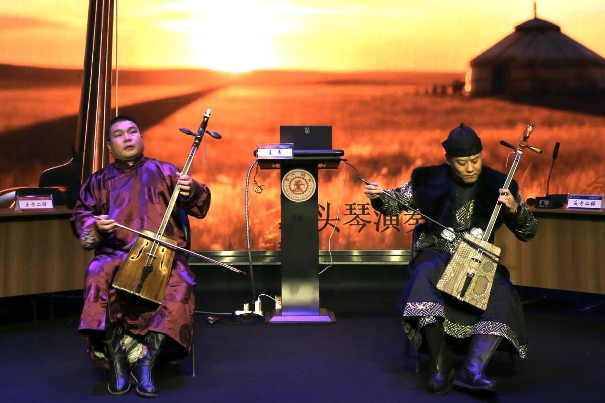 开场表演环节,马头琴演奏艺术家朝鲁门、唐斯格,为观众们献上了马头琴表演《我的祖国》《鸿雁》《万马奔腾》。