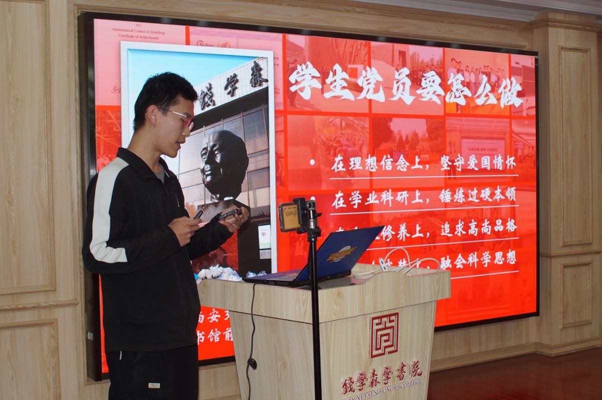 他重点阐释了钱学森学长“爱国、奉献、求真、创新”的精神,并结合时代背景,剖析其精神对国家科技发展、人民精神品格塑造的深远影响,号召学生党员从理想信念、学业科研、个人修养、理论武装四个层面对标先进,勇担使命;他还提到,“两弹一星”精神的核心是热爱祖国、无私奉献,自力更生、艰苦奋斗,大力协同、勇于登攀,而钱学森精神正是“两弹一星”精神的核心人格化身与重要实践源头。