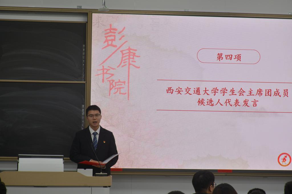 在西安交通大学学生会主席团候选人郑生智发言中,强调了学生代表在学校生活建设、服务学生方面的重要作用,敦促代表们郑重行使选举权利,积极发挥纽带桥梁作用。