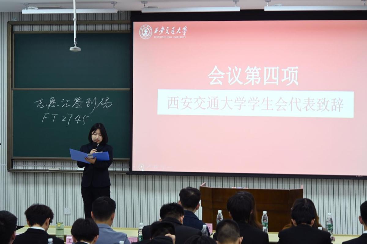 西安交通大学学生会代表李杨对大会召开表示祝贺。她充分肯定了仲英书院学生会在服务同学和深化改革方面取得的成效,并提出三点倡议:一要强化思想引领,传承西迁精神;二要深化组织改革,提升服务效能;三要聚焦主责主业,助力同学成长。她表示,学生代表是连接书院与广大同学的桥梁,肩负着责任与担当,希望全体同学能够助力书院开启学生工作的新局面。