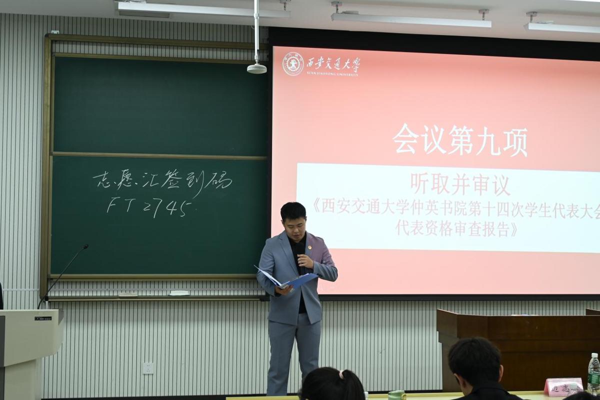 会议第二阶段,大会执行主席候选人王松涛作《西安交通大学仲英书院第十四次学生代表大会筹备工作报告》,大会执行主席候选人胡秉坤作《西安交通大学仲英书院第十四次学生代表大会代表资格审查报告》。《大会主席团组成人员、执行主席、秘书长建议名单》《大会总监票人、总计票人、监票人、计票人名单》及《西安交通大学仲英书院第十四次学生代表大会选举办法》依次进入审议环节,均全票通过。