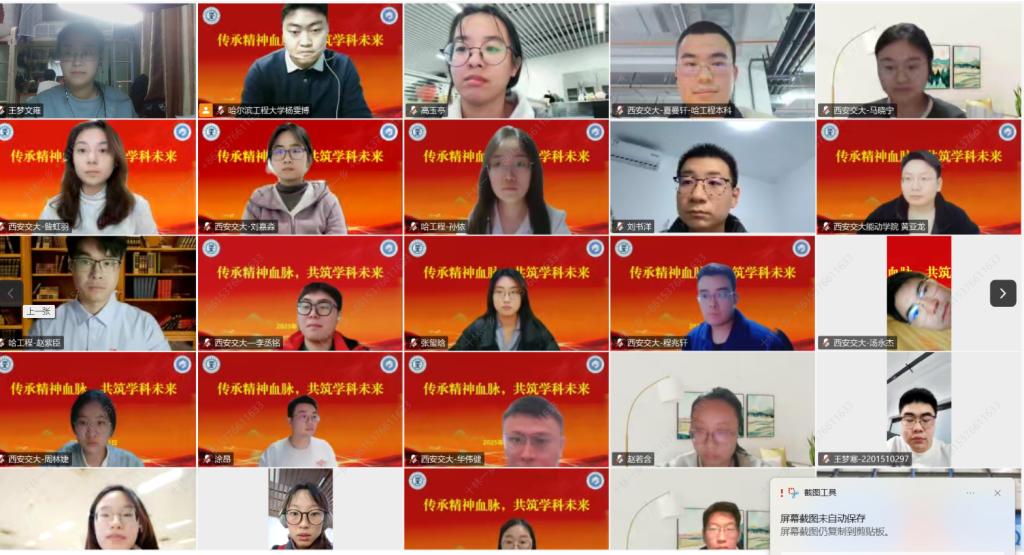 为深入学习贯彻党的二十大精神,加强高校间学生党支部的交流与合作,探索党建与学科交叉融合新模式,西安交通大学能源与动力工程学院与哈尔滨工程大学数学科学学院成功举办了主题为“传承精神血脉,共筑学科未来”的党支部共建活动。西安交通大学能动学院2024级热流科学与工程硕士第一党支部、2024级热能工程硕士党支部、2024级核科学与技术硕士第二党支部、2025级流体机械硕士党支部、2025级热流科学与工程硕士第二党支部,哈尔滨工程大学数学学院智能数据分析研究生党支部、本科生第一党支部、本科生第二党支部齐聚云端,共话初心使命,共谋学科发展。