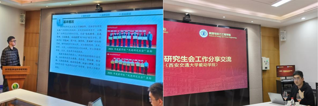 西安交通大学能动学院研究生会潘泽嘉、西北农林科技大学林学院研会主席团成员李亚轩分别代表研究生会从加强思想引领、深化组织改革、丰富校园文化、涵养优良学风、促进社会融入和创新服务内容等方面展开交流分享。
