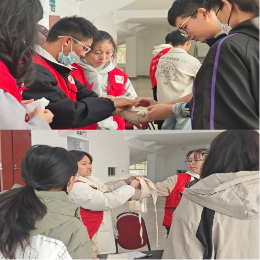 在三角巾止血法教学区,队员们则围绕不同出血场景展开教学,详细拆解三角巾多种包扎技巧,并明确止血带的核心使用规范。随后,同学们进行现场练习,逐步掌握“快速判断、科学止血”的关键方法,筑牢应对外伤出血场景的急救基础。