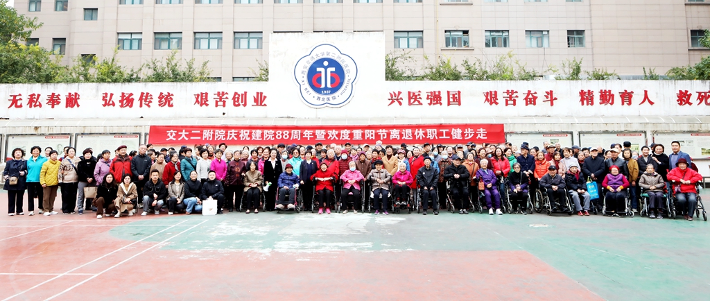 喜迎院庆,欢度重阳。为庆祝二附院建院88周年,欢度重阳佳节,10月29日上午,二附院庆祝建院88周年暨欢度重阳节离退休职工“健步走”活动在南院操场举行,二附院党委副书记党变玲,西安圣远和园颐养中心阮荣清经理、唐剑经理,陕西西安太平洋保险公司顾问三区王华经理亲临活动现场,同全院离退休老师欢聚一堂,共贺院庆荣光,欢度重阳佳节,大家欢声笑语,活动现场充满了喜庆祥和的热闹景象。二附院离退休办主任康芳琴主持“健步走”活动开幕式,介绍了参加活动的领导和嘉宾,并祝全院离退休老师重阳节快乐。
