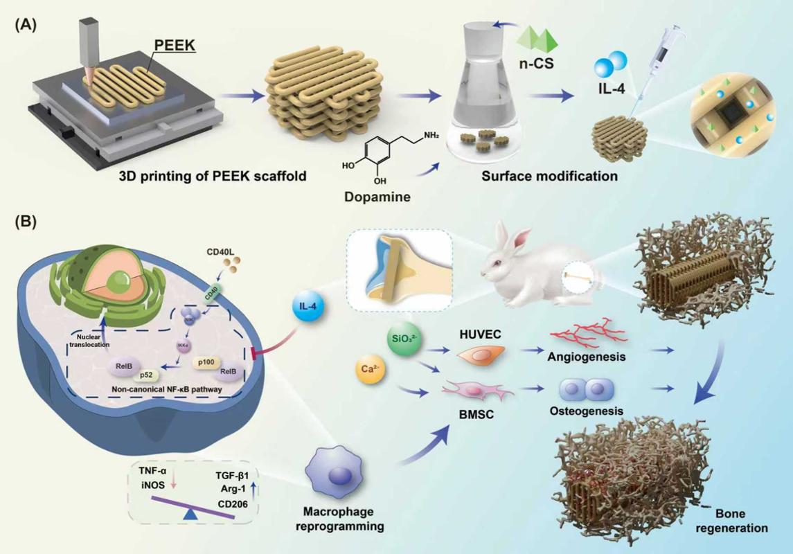 近日,西安交通大学第二附属医院骨科中心关节与足踝外科杨佩教授/马瑞副研究员团队与西安交通大学机械工程学院贺健康教授团队合作,在骨科植入材料免疫调控与骨再生领域取得重要进展。团队创新性地开发了一种具有双重功能的三维打印聚醚醚酮(PEEK)支架,通过聚多巴胺(PDA)辅助的纳米硅酸钙(n‑CS)/白细胞介素‑4(IL‑4)涂层协同调控免疫微环境并促进骨整合,相关成果发表于国际权威期刊《Chemical Engineering Journal》(DOI: 10.1016/j.cej.2025.170004)(中科院1区,最新影响因子13.2分)。论文第一作者为郭晓宇、苏艳文和吴紫萱,通讯作者为杨佩教授、马瑞副研究员及贺健康教授。