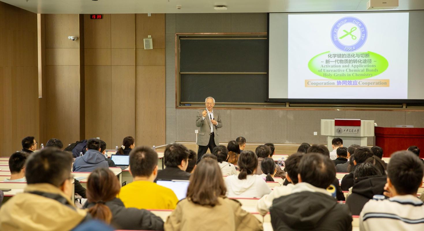 下午,席振峰在涵英楼报告厅面向全校师生作了题为“氮气的活化与转化——发展直接以氮气为氮源的合成化学”的报告。席振峰从课题组的研究标识引入,指出了“协同效应”在科研工作中的重要意义,鼓励团队成员之间相互借鉴、优势互补、共同进步。