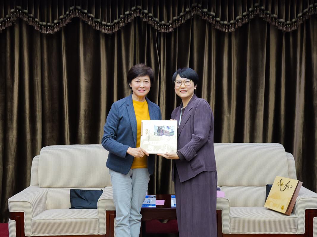 报告前,王欢与敬一丹就高校深化美育育人工作、青年沟通能力培养、新时代青年成长成才等问题进行了交流。