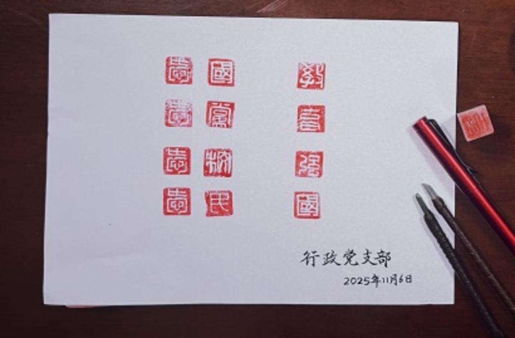 辩论结束后,支部以“篆在石上,刻在心里”为主题开展篆刻实践活动。在支部成员张隽岩的指导下,党员们雕刻“爱”“国”“党”“校”“教”“育”等主题印章,将党的精神内涵融入传统技艺。在“一刀一划”的专注中,体悟文化传承与党性锤炼的深度融合,把精神内涵转化为具象印记,切实强化理想信念与责任担当。