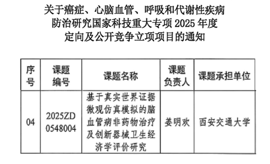 近日,国家卫生健康委医药卫生科技发展研究中心发布“癌症、心脑血管、呼吸和代谢性疾病防治研究国家科技重大专项”2025年度定向项目及公开竞争立项项目通知,“脑血管病非药物治疗及创新器械上市后的主动监测及卫生经济学评价研究”项目成功获批,该项目下设四个课题,其中“基于真实世界证据微观仿真模拟的脑血管病非药物治疗及创新器械卫生经济学评价研究”课题由西安交通大学药品安全与政策研究中心姜明欢副教授担任课题负责人。