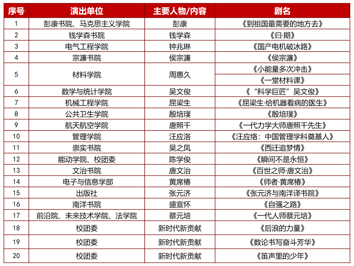 为系统总结育人成效,学校于今年组织开展“大先生”系列话剧育人成果评选工作。评选围绕“思想性、艺术性、教育性、创新性”四个维度,经院系推荐、专家评议和公开投票等多轮环节,最终《到祖国最需要的地方去》获一等奖;《殷培璞》《侯宗濂》获二等奖;《屈梁生·给机器看病的医生》《归·期》《一代力学大师唐照千先生》获三等奖。
