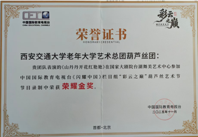 活动中,由26人组成的西安交大老年大学艺术总团葫芦丝团在学校艺术总团副团长王静老师及南英团长的带领下,带着一曲极具陕西地方特色的陕北民歌《山丹丹开花红艳艳》,以三声部葫芦丝合奏的形式完美呈现,荣获“荣耀金奖”。