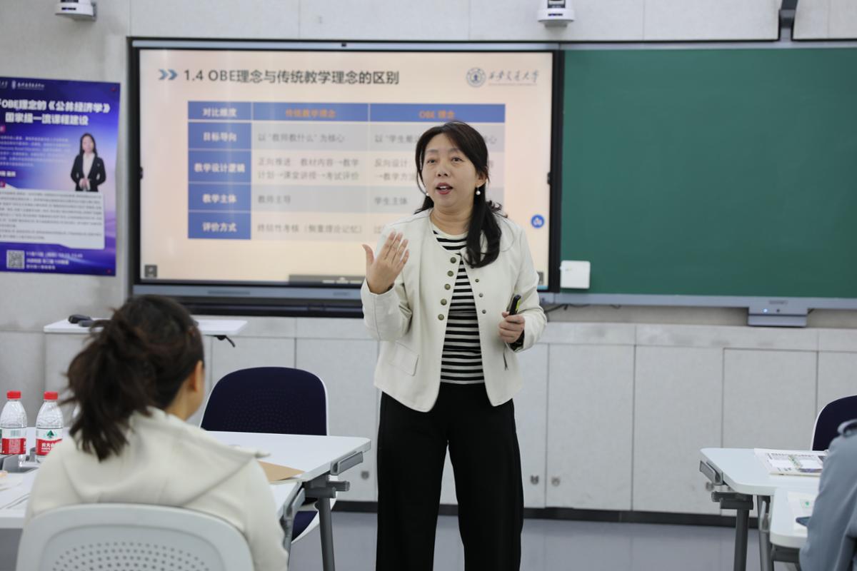 结合《公共经济学》课程建设的实践经验,雍岚分享了一流课程建设路径。在成果设定上,她明确了知识、能力、价值三大目标,尤其注重培养学生的现实问题分析能力与正确价值导向;在目标确立方面,她紧扣内外部需求,将课程与专业培养方案及国家社会需求紧密对接;在教学实施中,她优化内容构建清晰理论体系,出版两版教材,并创新采用云课堂互动、知识图谱、AI辅助教学等方式;在考核设计上,她引入多元互评机制,允许学生合理使用AI但需提交使用报告。