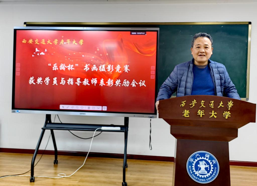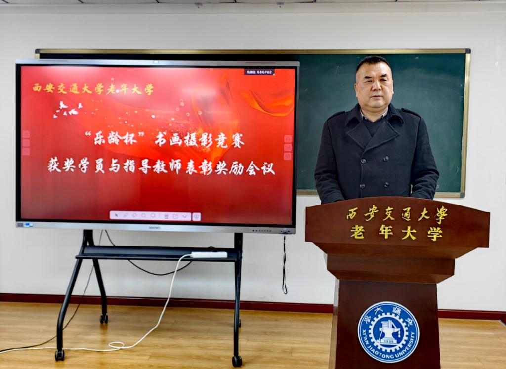 强自力副校长在会上宣读了表彰奖励决定。他指出,在本次“乐龄杯”竞赛中,西安交大老年大学选送的作品取得了优异成绩,共有29件作品获奖,包括一等奖7项、二等奖6项、三等奖16项,获奖总数和一等奖数量均在联盟高校中位居前列。同时,学校荣获“优秀组织奖”。依据《西安交通大学老年大学课程建设与教学奖励办法》,学校决定对获奖学员及指导教师予以表彰,为29名获奖学员颁发证书及奖金,授予8位指导教师“优秀指导教师”称号并颁发证书及奖金。